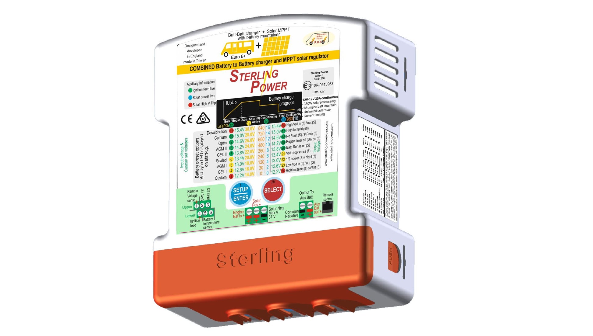 The new combined battery to battery charger and solar regulator maximises the operational usage of the battery to battery charger. It does this by adding a solar operation to the product both when the vehicle is in motion and moreover when the vehicle is stationary. This makes it, in effect, also a free 350W solar regulator when the vehicle is stationary. The open circuit voltage of the solar panels can be as high as 31V. This encompasses the majority of 12V nominal solar panels.